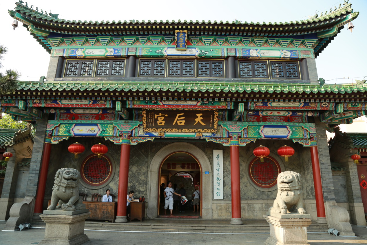 青島天后宮位于青島市南區(qū)太平路19號,始建于明成化三年(1467年),距今已有500多年的歷史,是青島市區(qū)現(xiàn)存最古老的明清磚木結構建筑群,崇禎十七年(1644年)擴建,占地面積8000平方米。整個建筑座北朝南,中軸線上自南而北依次為戲樓,二進山門,天后殿及龍王府,督財府二配殿。天后殿面闊三間,硬山頂。戲樓為重檐歇山頂,上覆琉璃瓦。后歷經(jīng)明、清、民國等七次維修擴建,俗稱中國大廟。為青島市區(qū)最早的廟宇建筑。1996年,青島市政府對其進行全面修復,并將其辟為“青島市民俗博物館”,于1998年12月26日正式對外開放。